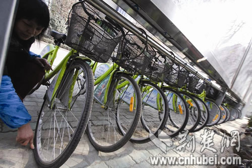 12月30日清晨7时许,武汉市公共自行车古田三路东方花城站,管理员刘润琴上班时惊奇地发现,停在路边的40辆公共自行车,有20辆的前胎全都瘪了。经检查,这些前胎全都被利器刺穿,且每隔一辆就被扎。虽经抢修人员全力修理,至昨日中午仍有一半没有修复。目前,警方已介入调查。饶纯武 摄
