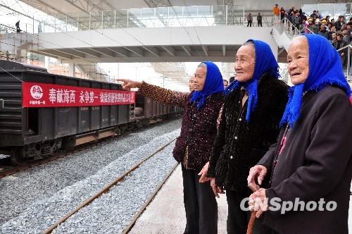 12月31日上午,一列货运火车从“妈祖故乡”福建莆田火车站缓缓驶离,三位老奶奶穿着新衣、戴着新头巾赶到火车站参观。 当日,福厦铁路正式开通货车试运营,莆田市也成为福建省最后一个通火车的地级市。 据悉,动车组最迟将在2010年4月驶上福厦铁路,开通客运试运营。届时,海内外妈祖信众到湄洲妈祖祖庙朝拜将更为方便。福厦铁路是国家"四纵四横"铁路客运专线和沿海铁路大通道的重要组成部分,线路自福州,经莆田、泉州至厦门,线路全长274.9公里,设计时速200公里。中新社发 林剑冰 摄