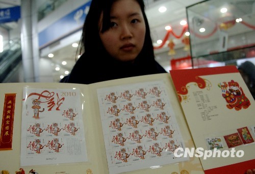 1月5日,虎年特种邮票在福州东街口邮局限量首发。再过一个多月,就将迈入中国传统虎年,福州市各种以老虎为造型的纪念物开始火热起来。中新社发 王东明 摄