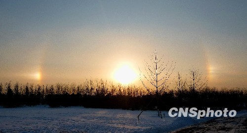 2010年1月6日傍晚,北京西部天空,在太阳的左右两侧,各出现了1个小“太阳”,相互辉映十分美丽壮观。中新社发 玉龙 摄
