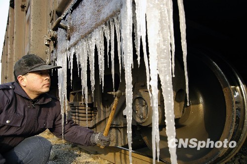 1月7日,安徽淮北矿业铁运处职工正在检查一辆挂满了冰凌的列车车辆轮轴。针对近日中国大部分地区遭受罕见严寒袭击,电煤运输吃紧情况,淮北矿业铁运处职工冒着严寒奋战在各自的岗位上,确保电煤及时安全外运。中新社发 张山石 摄