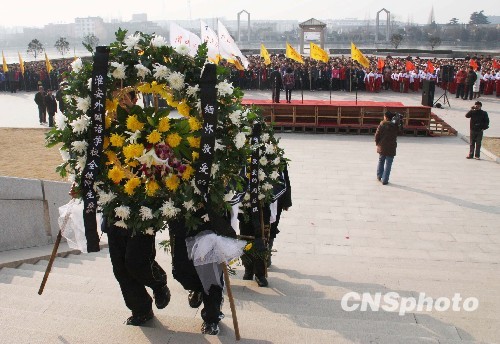 2010年1月8日,江苏省淮安市楚州区,总理家乡的群众在周恩来纪念馆前举行悼念仪式纪念周恩来总理逝世34周年,并向周总理的汉白玉像敬献了花篮。中新社发 阿峰 摄