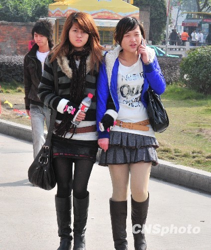 1月10日,尽管近来受冷空气影响,福州持续低温,不少年轻女孩依然裙装一袭,美丽“冻”人。中新社发 张丽君 摄