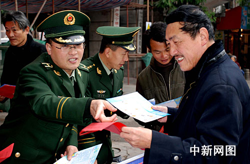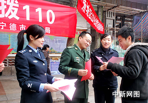 1月10日,在福建宁德市八一五中路,边防民警向市民发放宣传单,介绍边防110建设的相关情况。当日,福建宁德市公安局组织开展“危难见真情 请拨110”为主题的大型爱民实践宣传活动,让市民了解110、支持110,有效推进构建和谐警民关系的进程。