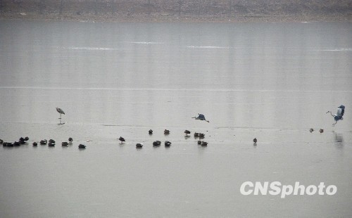 1月10日,济南市平阴县玫瑰湖黄河湿地公园里成群的水鸟栖息、飞翔。玫瑰湖黄河湿地公园内良好的生态环境为大量湿地野生动物提供了栖息、繁衍的环境,每年都吸引了大量的白鹭、野鸭等水鸟前来过冬。中新社发 张庆民 摄