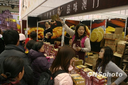 1月10日,北京“活力澳门推广周”活动上,众多市民围在一个展台前购买澳门小吃。超过百家澳门企业参加了此次活动。北京市民几乎可按实惠的澳门当地价购买澳门特色商品。中新社发 苏丹 摄