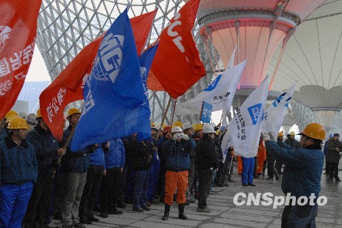 1月11日,“全面冲刺,全力拼博,全面完成园区建设任务”誓师大会在上海世博园区世博轴十米平台隆重召开。世博局局长洪浩向世博工程建设的参建单位、建设者特别是来自五湖四海的农民工兄弟致以崇高的敬意和感谢。世博局副局长、世博工程建设指挥部副总指挥丁浩颁发了世博园区工程建设“军令状”。世博园区各工程项目项目经理签署世博工作建设承诺书。据介绍,上海世博会建筑工程量已完成90%,剩余的工程主要为遮阳、排水、停车、绿化等项目。世博园区现在有3万多工人正在加进施工。中新社发 海牛 摄