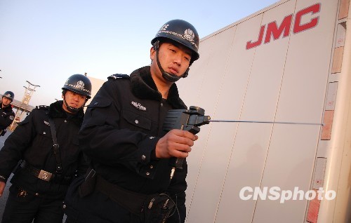 2010年1月12日,山西新绛警方加大涉爆涉危品防控确保安全稳定。当日,在全省启动的社会治安“冬季行动”中,山西运城新绛县公安局治安管理大队民警全警出动,加大和引深对民爆、剧毒危险化学品等至关国家财产和人民群众生命安全涉爆涉毒涉危企业及车辆等24小时重点查防监控,全力为新年创建良好社会治安环境。中新社发 高新生 摄