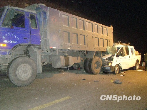 1月12日晚,贵州省六盘水市水城至黄果树高等级公路99公里+800米处发生交通事故,一辆白色皮卡车在行驶途中撞在一辆大型货车尾部,当场造成皮卡车上2人死亡,2人受伤被困。当地消防官兵接警后迅速赶到现场,成功将被困人员救出送往医院救治。中新社发 倪凡凡 摄
