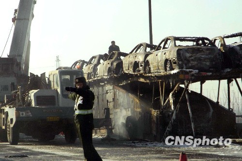 2010年1月13日,一辆满载崭新轿车的大货车在京福高速济南段起火后,被及时赶到的消防队员扑灭。据观察,货运车上运载的10余辆新车被大火烧成了残骸。济南高速路交警部门正在对起火原因调查中。中新社发 高桦 摄
