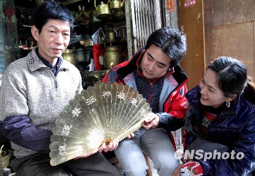 1月中旬,广州恩宁路一铜器店店主苏少伟(左一)向人们展示他用铜材手工制作出的三斤重铜扇,据店主介绍,铜扇源于明代,为道教练功者始创,相比一般的刀剑,铜扇在防身的同时,也不会显得粗暴,在明代曾盛极一时。中新社发 罗仰明 摄
