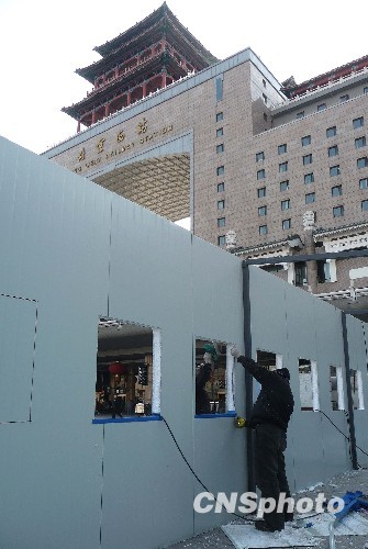 1月14日上午,在北京西站北广场西侧,工人们开始搭建临时售票处,为即将到来的春运做准备。据悉,正在搭建的是北京西站的第一批临时售票处,共15个窗口。1月16日开始,北京西站还将增加搭建120个临时售票窗口。这135个窗口都是为了春运搭建的,将于20日左右开始启用。中新社发 玉龙 摄