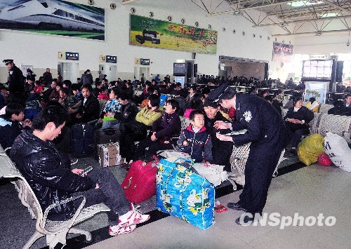 1月17日,福州火车站侯车大厅里座无虚席,铁路公安提前进行春运打击倒卖车票违法犯罪行为,图为福州铁路公安正在回访回乡群众。春运潮提前主要原因在于在闽务工人员和学生提前返乡。2010年铁路春运自1月30日起至3月10日止,为期40天。其中节前15天,节后25天。中新社发 张丽君 摄