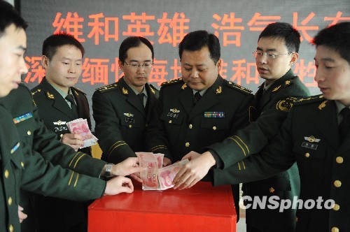 1月19日,山东公安边防总队组织机关全体官兵为在海地地震中光荣牺牲的维和英雄捐款,寄托对战友的哀思之情。中新社发 由永怀 摄