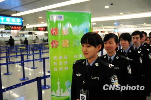 在迎世博倒计时一百天即将到来之际,七十六名通过公务员考试的新警,又经过了出入境法律法规、人像识别、证件鉴别等专业考核,于十九日正式投入迎世博出入境边检工作。守护上海世博空中门户的“世博新警”将具体担负起服务出入境旅客、维护浦东机场口岸安全、展现国门文明形象的职责。图中浦东边检站“世博新警”正手持验讫章,准备上岗。中新社发 陈静 摄