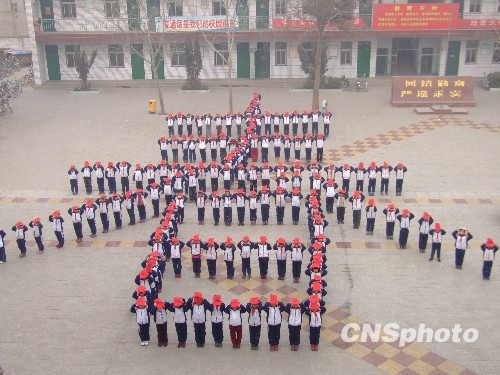 1月19日,河北省广平县明德小学500名学生用双手托起了一幅幅书法作品组成一个长20米、宽18米的巨型“春”字,以“迎春接福”这种特殊方式喜迎新春佳节的到来。中新社发 程学虎 摄