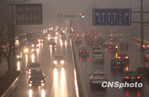 2010年1月20日,济南的道路上,车辆开启大灯行驶。当天,受一股冷空气影响,济南降下小雨,白昼如同黑夜。济南市气象台发布寒潮蓝色预警信号,预计降温幅度在10℃以上。中新社发 龚辉 摄