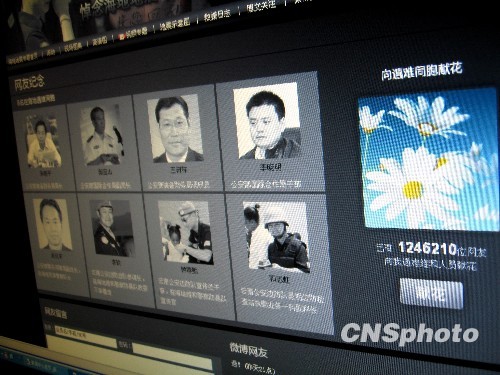 1月20日,中国网民在网络上悼念8名海地遇难的中国维和警察,在“我要献花”的点击处,显示的数字已经突破百万。当日上午,八宝山殡仪馆大礼堂举行向英烈遗体告别的仪式。中新社发 杜洋 摄