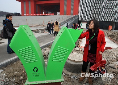 1月20日,上海世博园区内立起了小巧可爱的新型气力垃圾箱,绿色外形仿若两片小嫩芽。这种垃圾箱的底部配有超大气力输送系统,垃圾输送过程全封闭,无需人工操作或直面垃圾。据了解,这种垃圾处理系统是中国首次应用于大型场馆和市政道路,在亚洲中堪称领先。中新社发 潘索菲 摄