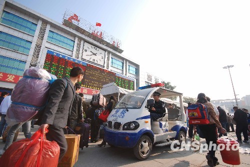 春运前夕,广州铁路公安局增派警力加强车站安保工作,并在广场周边、进出站口、售票厅、候车大厅等设点引导旅客有序进站、购票。同时,利用电瓶巡逻车在广州火车站周边24小时巡逻和安全守候,接受旅客报警和咨询,方便旅客出行,旅客亲切的称为“铁警110”。中新社发 牟财源 摄
