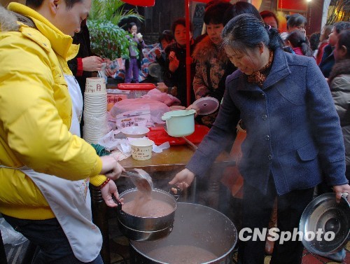 1月22日,是中国农历十二月初八即传统的腊八节。位于重庆主城中心闹市区的罗汉寺向当地市民布施腊八粥。腊八节是中国汉民族的传统节日,也被视为春节的前奏。为庆祝腊八节,民间大都流行喝腊八粥,多数佛寺也会在腊八节这天准备好腊八粥招待进寺礼佛的信徒和讨吉利的市民游客。图为不少当地市民排队等候寺庙的施粥。中新社发 胡虹 摄