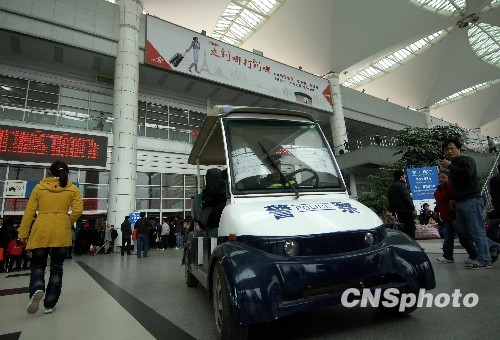 1月22日,福州火车站警方动用电动巡逻车在售票大厅里随时打击票贩子。当日,福州火车站已提前进入春运备战状态。中新社发 王东明 摄