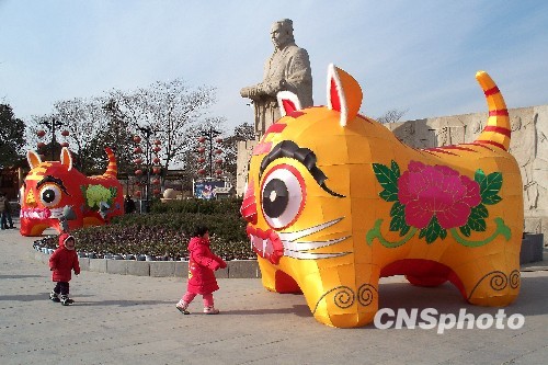 1月23日,在河南省开封市清明上河园内,两位小游客在巨型老虎造型彩灯前玩耍。农历虎年将至,各种各样以虎为主题的饰品、彩灯纷纷亮相河南省开封市公园景点和街头,营造出浓厚的节日喜庆气氛。中新社发 李俊生 摄
