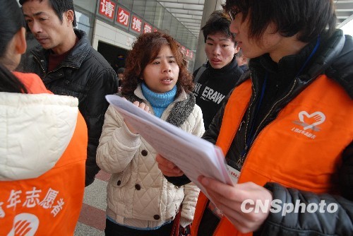 1月23日,大学生志愿者在无锡火车站售票大厅外为乘客提供引导服务。2010年春运在即,无锡江南大学教育学院的大学生们利用寒假时间,组成一支志愿者小分队,为铁路无锡站南来北往的乘客提供多种形式的便民服务,受到乘客的欢迎。中新社发 还月亮 摄