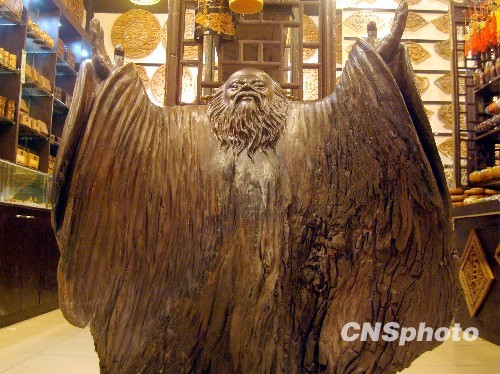 1月下旬,在苏州一家根雕艺术工作室内,由姑苏艺人精心雕刻而成的《老子》根雕工艺品吸引了众多顾客的目光。 据介绍,该尊根雕高达1.3米,材质为千年阴沉木根,是根据其自然造型,将春秋时著名哲学家和思想家老子的形象雕刻得栩栩如生。 中新社发 王建康 摄