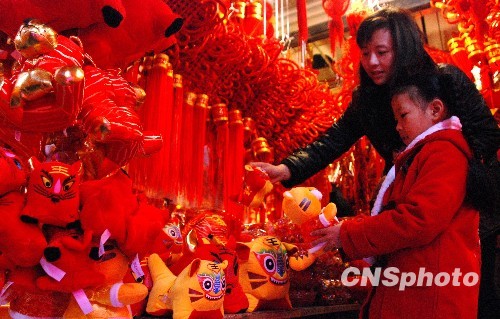 近日,农历虎年春节日益临近, 重庆街头虎年年味也日渐浓郁。在重庆一小商品批发市场,以“老虎”为主题元素的玩具、挂件、窗花、对联成为年前的热销商品。中新社发 胡虹 摄