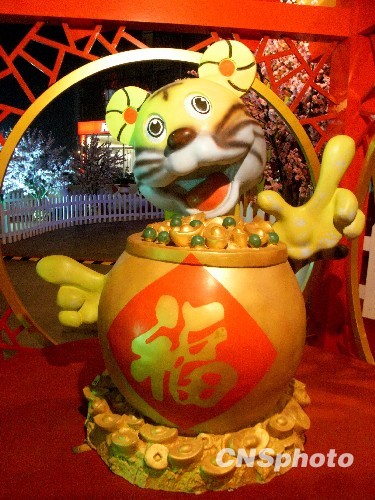 2010年1月26日晚,伴随着新春佳节的临近,石景山区万达广场前,摆放了财神、虎娃等吉祥的玩偶营造出欢乐、祥和节日景观,吸引市民驻足观赏。中新社发 李文明 摄