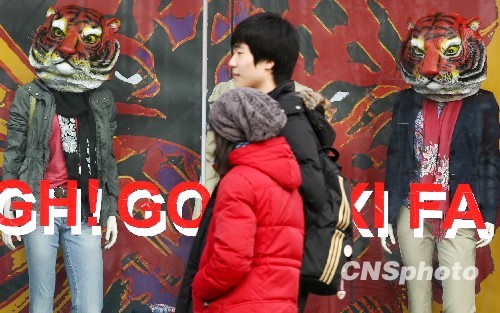1月27日,北京一家商店橱窗内被装上虎头的模特注目路过的一对情侣。虎年将至,商家纷纷支出以“虎”为主题的搞怪绝招吸引顾客的眼球。中新社发 苏丹 摄