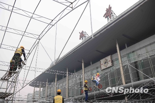 1月下旬,工人们在成都火车站站前广场上搭建春运临时候车大厅。据了解,目前成都车站候车厅可容纳候车人数12000人,新建的临时候车大棚面积4700平方米,建成后可容纳6000名旅客临时候车,还将新增50个临时售票窗口。将在春运中投入使用。届时,加上售票大厅已有的窗口数量,车站的售票窗口总数将达到110个,将为春运出行的旅客提供方便。中新社发 曹宁 摄