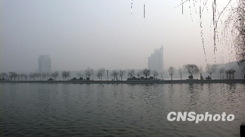 1月31日,河南省开封市包公湖畔雾中美景。当日,开封市雾气弥漫,市区建筑在雾中若隐若现。中新社发 李俊生 摄