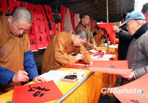 2月1日,上海玉佛寺山门前排起了一列请赠春联的长队,当场挥毫的10位玉佛禅寺的法师为市民们奉赠墨宝,在接下来的3天时间里,他们将书写上千幅春联,内容既有“瑞气迎春到,祥云降福来”等新年祝语,也有“迎世博,浦江两岸映朝晖”;“庆盛会,华夏故园尽彩虹”等为上海世博会加油的吉句。中新社发 李佳佳 摄