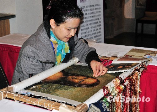 2月1日,海峡两岸民间工艺绝技展示活动上,苏绣界国手、中国国家高级工艺师蔡梅英现场运用变换针法,刺绣《蒙娜丽莎》。该幅作品创作已近两年,价值近百万,而蔡梅英的作品曾被中国国家珍宝馆、奥委会等收藏。中新社发 张丽君 摄