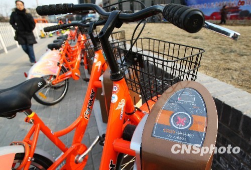 近日,提倡节能减排、市民可持卡租用的40多辆橙色新型自行车亮相北京东四地铁口,并将于春节前进入运营阶段。中新社发 富田 摄