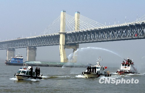 2010年2月1日,长江安徽段举行“世博安保”启动仪式,全副武装的长航芜湖公安特勤队员驾驶公安巡逻艇和消防艇,在辖区重点水域开展治安和消防巡逻检查,并对船员进行安全防范和法律常识宣传。此次仪式标志着“世博安保”护城河工程在长江安徽段正式拉开序幕。中新社发 芜讯 摄