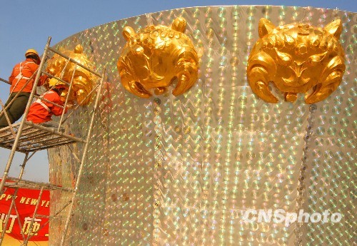 2月2日,北京奥林匹克公园“鸟巢”旁,工人们在悬挂吉祥“虎头”,准备迎接即将到来的虎年春节。 中新社发 吴芒子 摄