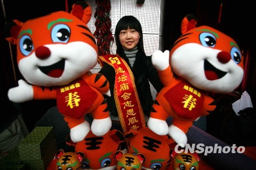 2010年2月2日,北京地坛庙会吉祥物“威威”与北京城市学院的24名大学生庙会服务志愿者同台亮相,他们将共同为今年的庙会游客提供优质的游园服务。2月13日至2月20日第25届春节文化庙会将在地坛公园举行。人们习惯将庙会作为一种年节风俗,逢年必赴,称为“逛庙会”。 中新社发 陆欣 摄