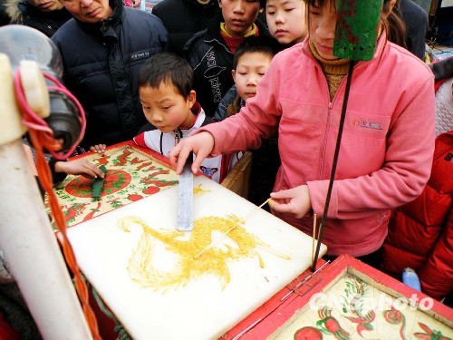 2月3日,在河南项城市区街头,一处制作糖画的摊档吸引众人前来欣赏。糖画是一种传统民间艺术,俗称“倒糖人儿”,是民间艺人用糖稀熬制到合适温度后,以铜勺为画笔,把熬好的糖液在干净平整的石板上浇制而成。糖画的题裁主要是各种动物,有龙凤呈祥、生肖造型等。图为正在精心制作糖画。中新社发 刘颖光 摄
