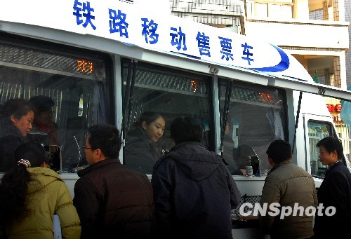 最近京城一些地方出现“铁路移动售票车”,大大的方便大型居民小区及流动人口密集地人员购买火车票。据悉,每辆移动售票车设置3个售票窗口,预售10天的火车票。中新社发 李文明 摄