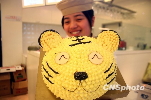 2月4日,浙江台州市蛋糕店的点心师展示卡通虎脸蛋糕。中新社发 王天荣 摄