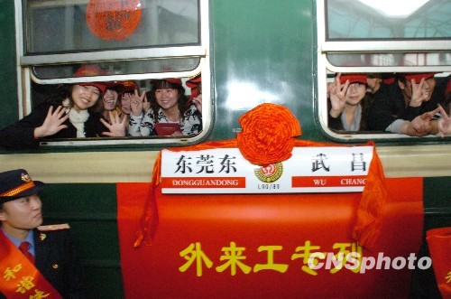 2月4日,1趟外来工专列从广东东莞东站开出,八百多名在东莞务工的农民工坐上专列返乡,从2010年2月3日起至2月10日期间,广铁集团将为“新东莞人”农民工安排9趟专列送他们返乡欢度春节。中新社发 罗仰明 摄