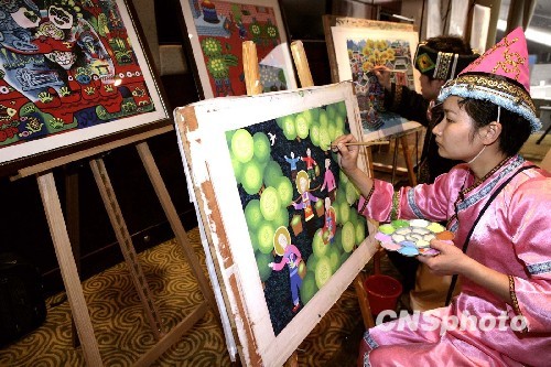 2月4日,广东龙门县推介会在香港万丽海景酒店举行,推介会以开放的形式进行,现场设有“龙门旅游一条街”、龙门农民画廊、土特产展示等,多角度展现龙门改革开放成就。图为龙门农民画家现场绘画。中新社发 张勤 摄