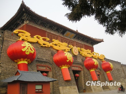 中华民族传统节日春节来临之际,世界自然与文化遗产泰山脚下的山东泰安岱庙正阳门上挂上了“恭贺新春”的巨型花灯,迎接新春的到来。这组巨型花灯共4只,花灯直径3米,高6米。中新社发 贺安栋 摄