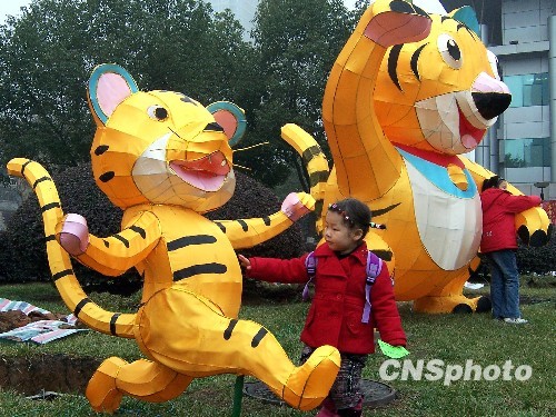 2010年2月7日,10座“卡通虎灯”亮相江苏省南京市街头,为即将到来的新春佳节增添了喜气。这批“卡通虎灯”由江苏省扬州市民间艺人制作,造型各异,憨态可掬,吸引了众多小朋友的喜爱。中新社发 安东 摄