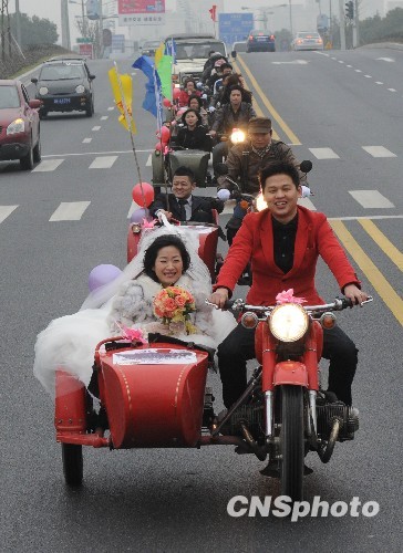 2010年2月7日下午,一支由8辆老式边三轮摩托车组成的新婚车队在嘉兴拉风上街,赚足了市民的眼球。据了解,新郎沈志恒是老式边三轮摩托的资深玩家,这次他特别组织同好从上海和嘉兴各地开着边三轮赶到嘉兴组成边三轮婚礼车队,用这种特别的方式庆祝自己的婚礼。中新社发 李剑铭 摄
