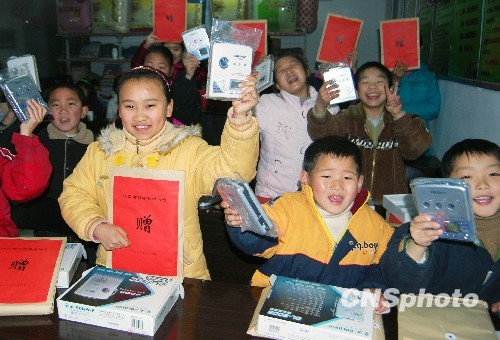 2月9日,江苏省镇江市润州区金山街道黑桥社区成立“外来务工人员子女假日辅导站”,镇江市科协向该社区的外来务工人员子女和困难家庭的中小学生赠送了55只复读机和200多套科普书籍。中新社发 石玉成 摄