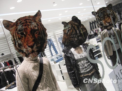 2月9日,虎年春节临近,北京一家商场的商铺请来“虎头模特”招揽顾客。面对春节商机,商家纷纷推出以“虎”为主题的促销手段吸引顾客的眼球。中新社发 杜洋 摄